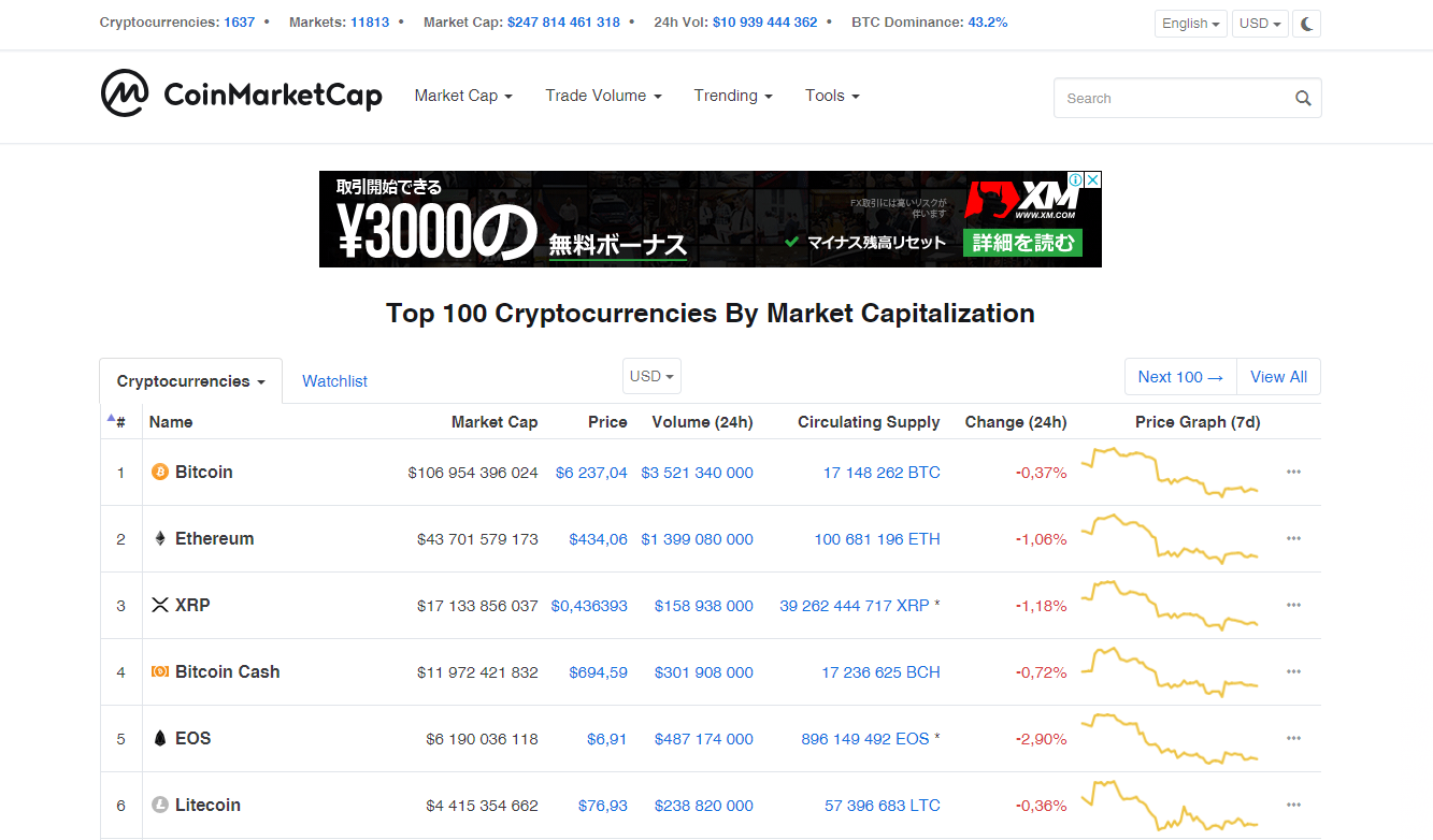 Основной реестр информации на рынке. Удобный инструментарий позволяет в пару кликов найти интересующую монету или токен, получить его финансовые данные, список поддерживаемых бирж, а также ссылки на соц.сети и сайт.