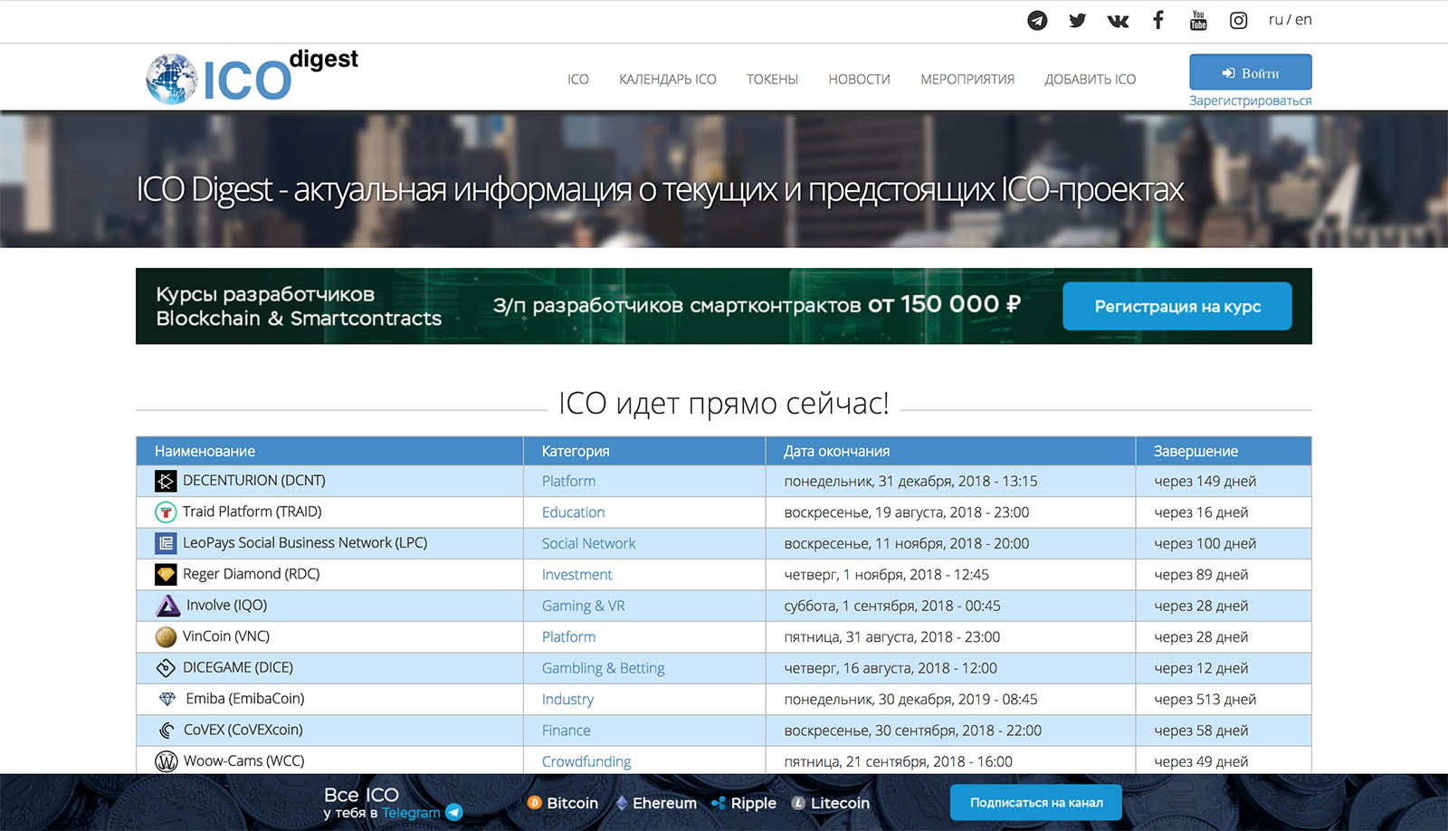 Самая актуальная информация о текущих и будущих ICO выведена на главную страницу сайта, а в каталоге представлены все проекты и самая полная информация о проекте — от ссылок на социальные сети и до членов команды. Для удобства пользователей, листинг имеет канал в Telegram, благодаря которому удобно следить за всеми ICO прямо в мессенджере.