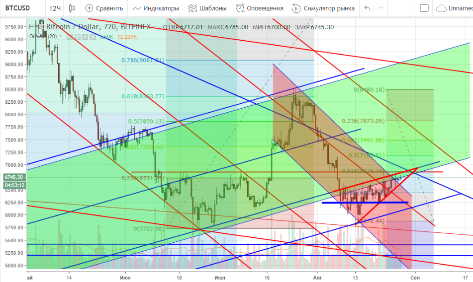 Имеем то, что и было – движение биткойна в боковике продолжается. На дневном таймфрейме появилась свеча 26 Августа «перевернутый молот» (или как его еще называют – «повешенный»). Вместе с медвежьим клином такой вариант больше располагает к падению, чем к продолжению роста. Как я писал до этого, ниже, на $6 250 важный уровень, от которого покупали крупные игроки. Поэтому сильно ниже уйти не должны. Если объемы на покупку на этой отметке будут расти, то это подтвердит силу быков и возможность похода на $7 000. Пока мысли такие.