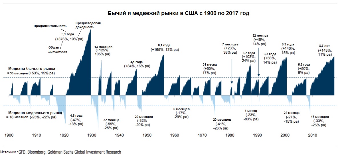 Столь продолжительный подъем, идущий с 2009 года — без малого 9 лет — следует тому же сценарию, который происходил незадолго до «Великой депрессии» начала 20 века, и команда Голдман Сакс заявляет следующее: