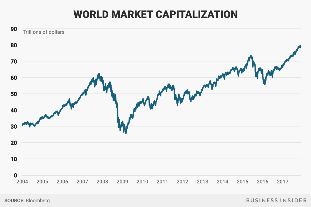 Если проссумировать стоимость акций всех компаний мира, то технически вы получите рыночную капитализацию планеты Земля. Так вот, за какие-то несколько месяцев капитализация мирового фондового рынка взлетела до $80 трлн, и продолжает планомерное движение к отметке в $100 трлн*.