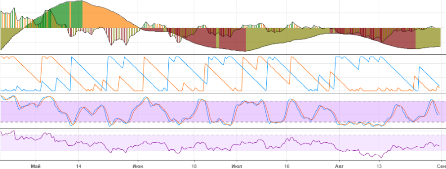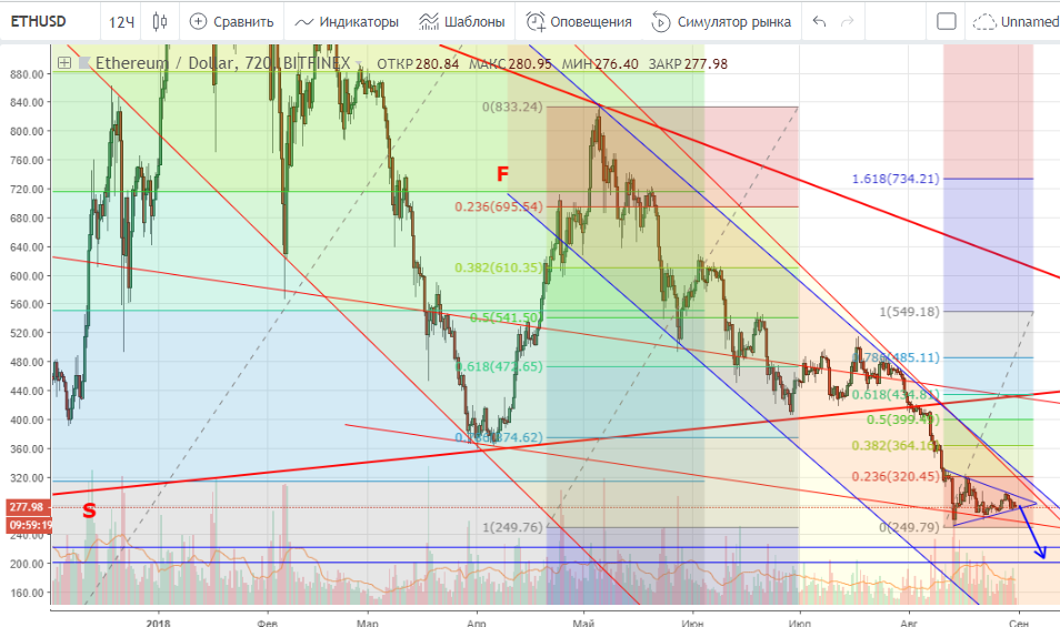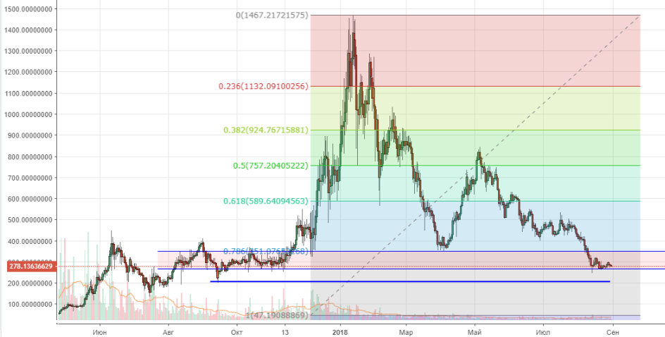 Эфир за последние дни опять приблизился к минимумам середины августа. На графике мы видим равносторонний треугольник, при отработке которого (при условии, что биток и дальше продолжит падение), цена эфира может опуститься к уровням $220 — $200 ($190).В случае реализации положительного сценария, сопротивлением выступает уровень на $290, пробитие которого открывает дорогу к тесту $320 (фибо 23,6%) — $365 (фибо 38,2%). Последний выступает сильным сопротивлением движению вверх, что при недостаточных объемах и силе быков может вылится в боковик. Это если мы говорим о росте, конечно. По рынку в целом тренд остается падающим, поэтому пока больше смотрю вниз, где ближайший значимый уровень поддержки находится на $250.
