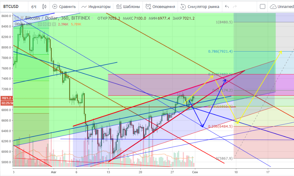 По ситуации на сейчас: ближайший ориентир сверху – фибо 50% ($7 180), сопротивление $7 100. Если была купля по $6 800, то можно держать. Стоп под $6 850.