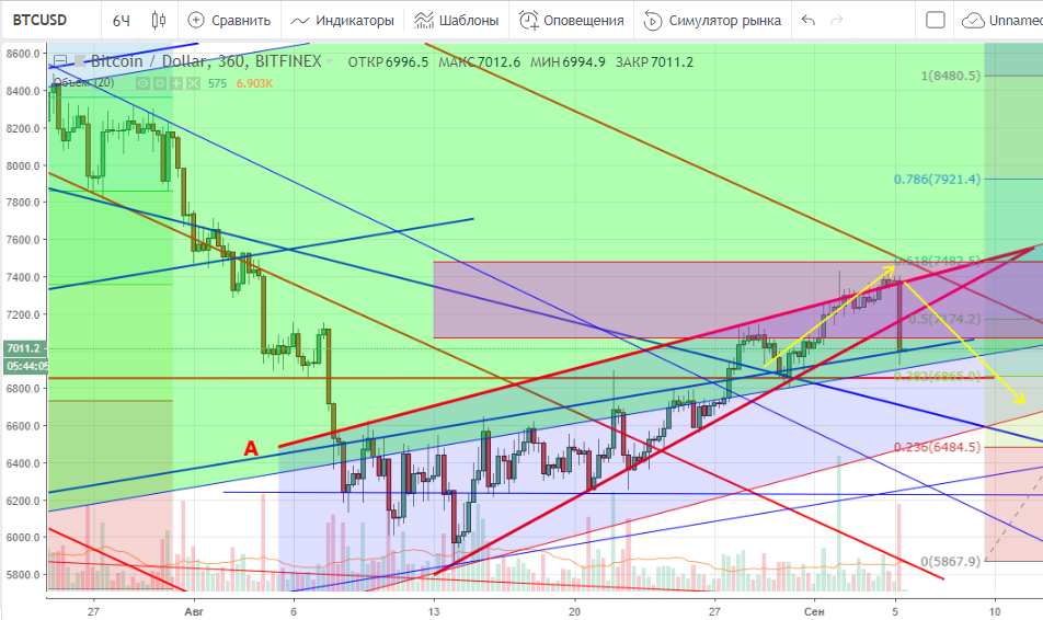 Вангую, что падение продолжится. Поддержку на $6 921 обозначили, следующая остановка должна быть на $6 600 — $6 500, у нижней границы подканала. Пока цена находится в этом подканале, говорить о развороте вниз преждевременно. Посмотрим, как закроется день.