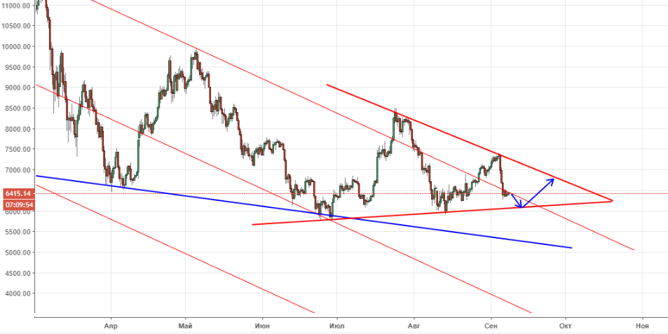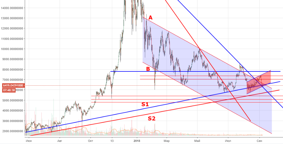 Ниже есть поддержка S2 (он же прошлый лоу) на $5 800. То есть сходить туда шансы, конечно, есть. Но, более вероятным сейчас видится заход к $6 100 — $6 000 и далее коррекция к $6 700 — $6 800.