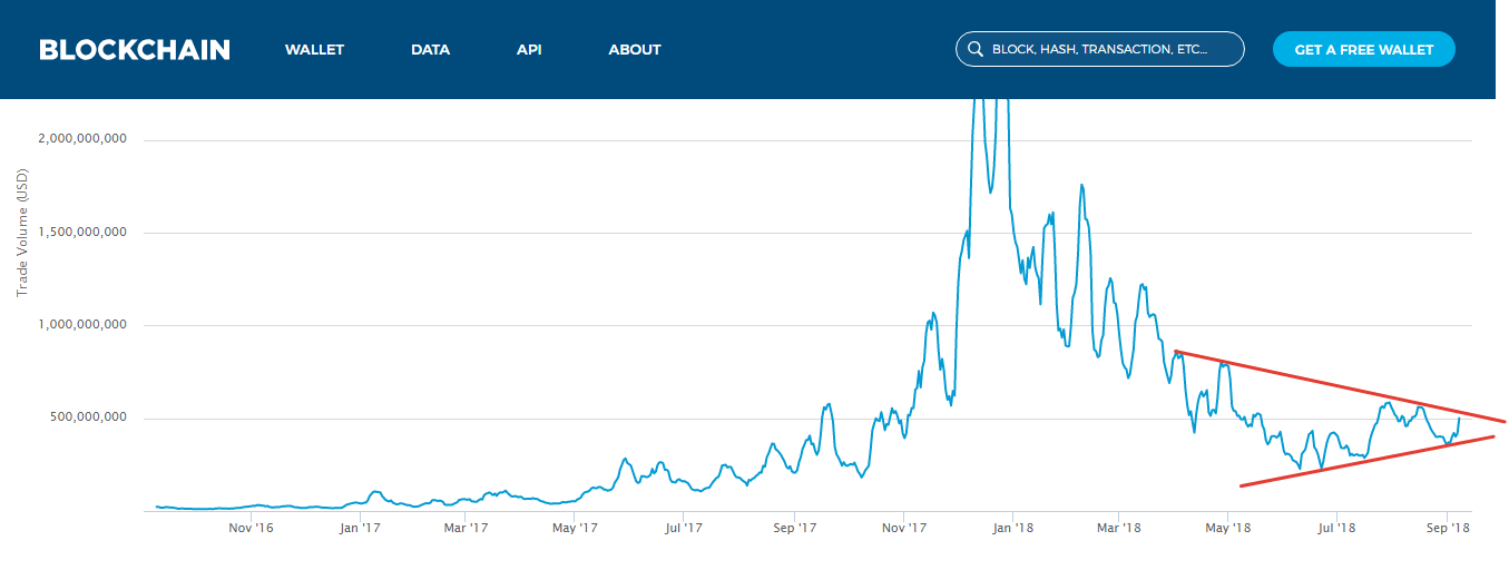 Есть на blockchain.com информация по ежедневному объему торгов BTC к USD (основные крупные биржи). Так вот объемы торгов растут где-то с середины Июля, что говорит об определенном оживлении на рынке. Тынц https://www.blockchain.com/ru/charts/trade-volume?daysAverageString=7×pan=2years