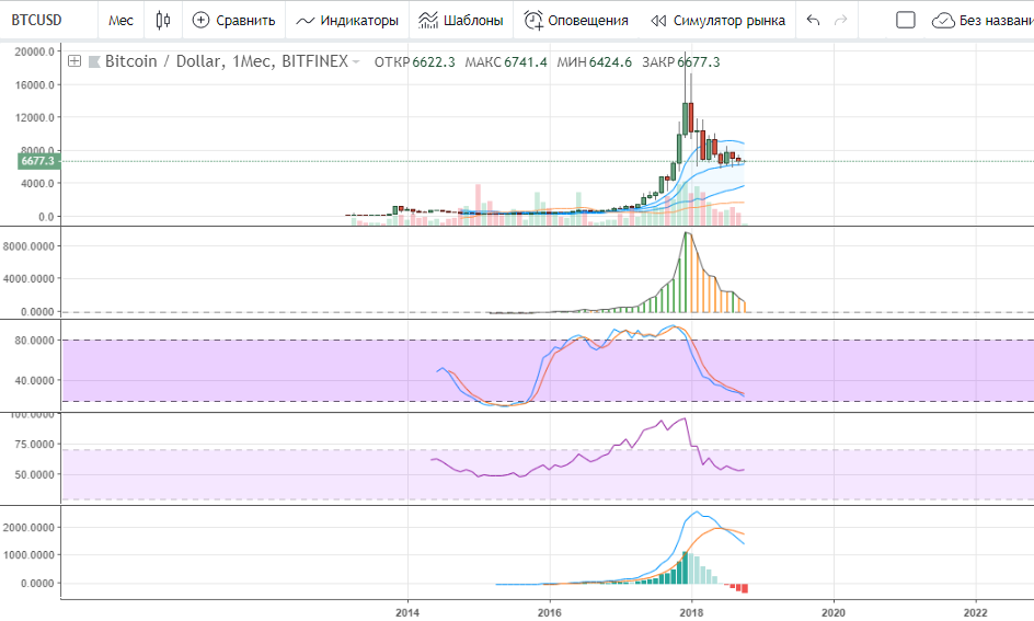 В связи с затяжным флэтом биткойна и рынка в целом, мнения людей разделились примерно 50/50. Кто-то ожидает скорого «ту зе мун», другие же напротив говорят о продолжении медвежьего тренда. Предлагаю посмотреть на графики с различными таймферймами и разобраться в ситуации.