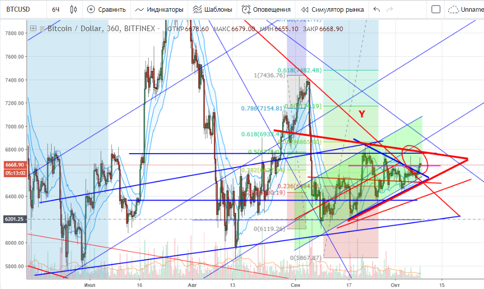Таким образом мы получаем примерные границы движения до середины-конца Октября: $6 250 — $7 000 (плюс-минус 200 пунктов) с прицелом выхода к $8 500.