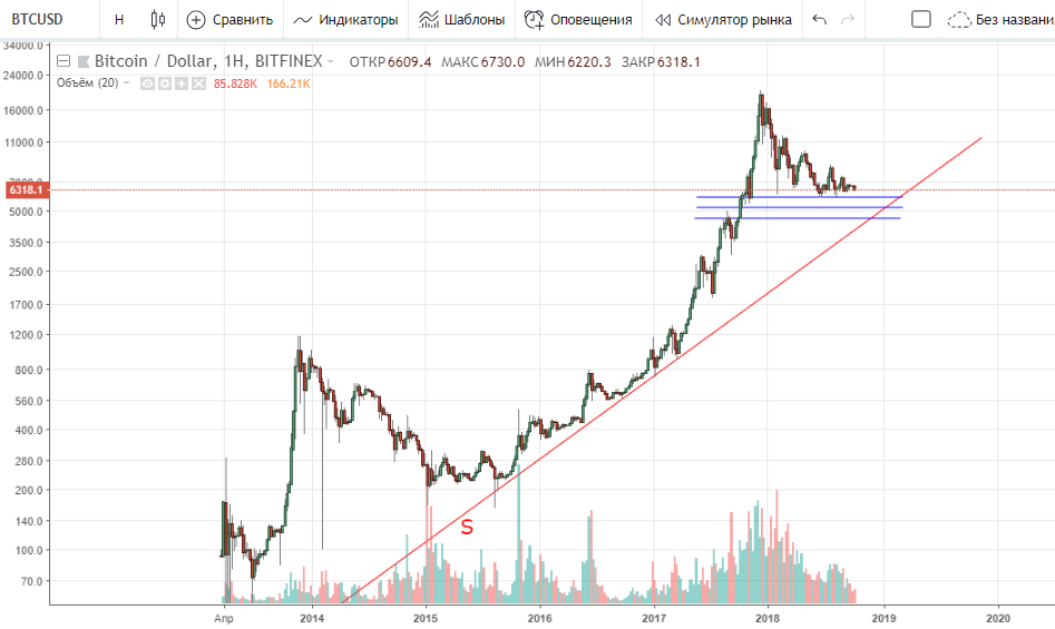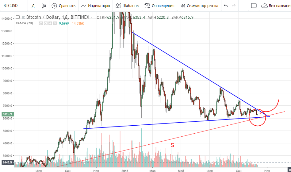 Даже не смотря на вчерашнее падение, рынок еще не определился куда идти. Думаю, недельку может пофлэтить. Наиболее важным уровнем в этой ситуации выступает $6 120 — $6 000: здесь проходит нижняя граница треугольника и линия поддержки тренда S. Сквиз может, конечно, быть. Скорее всего откупят. Но, вот если закрепимся ниже $5 750 — $5 500, то дальнейший сценарий развития приобретает совсем уж медвежий цвет. Тогда $5 200 — $4 500 будут ближайшими ориентирами вниз.