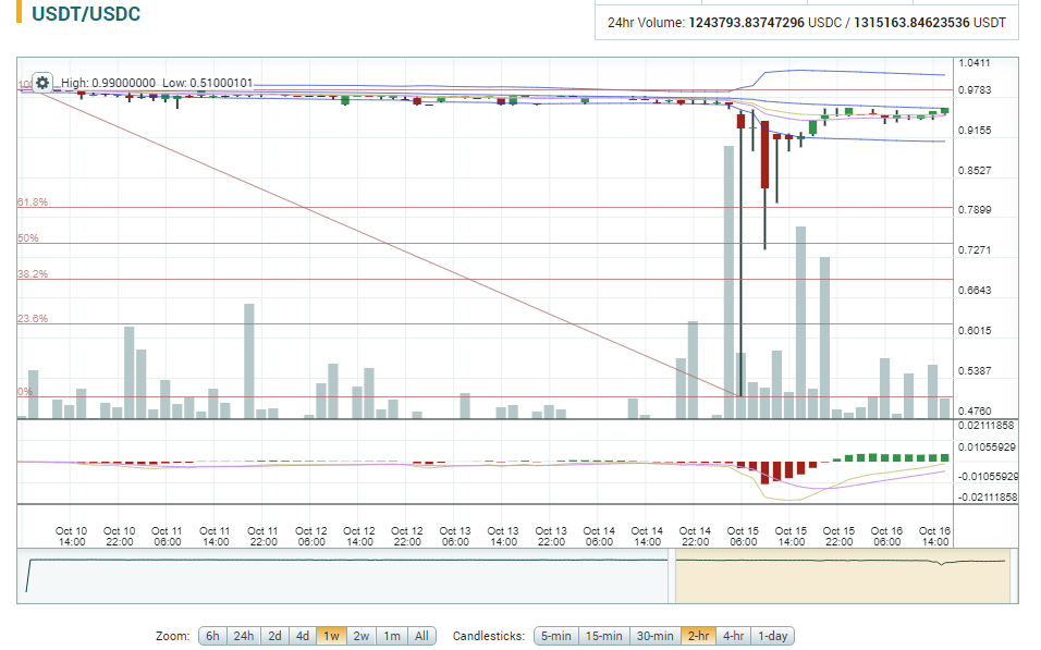 Кстати, произошло еще одно очень интересное событие – сильный дамп Tether (USDT), к примеру, на бирже Poloniex, его курс к другому стейблкойну, USDC, в момент упал почти в 2 раза. В чем же была причина?