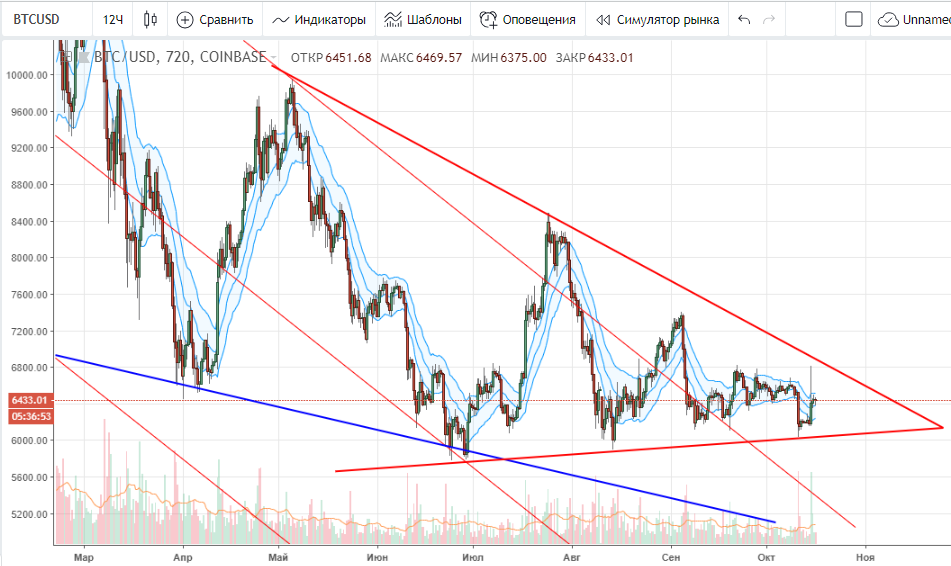 Никакого пробоя большого треугольника не было, мы по-прежнему остаемся внутри в диапазоне $6 000 — $6 800, а боковик спокойно может продолжаться еще до середины ноября.