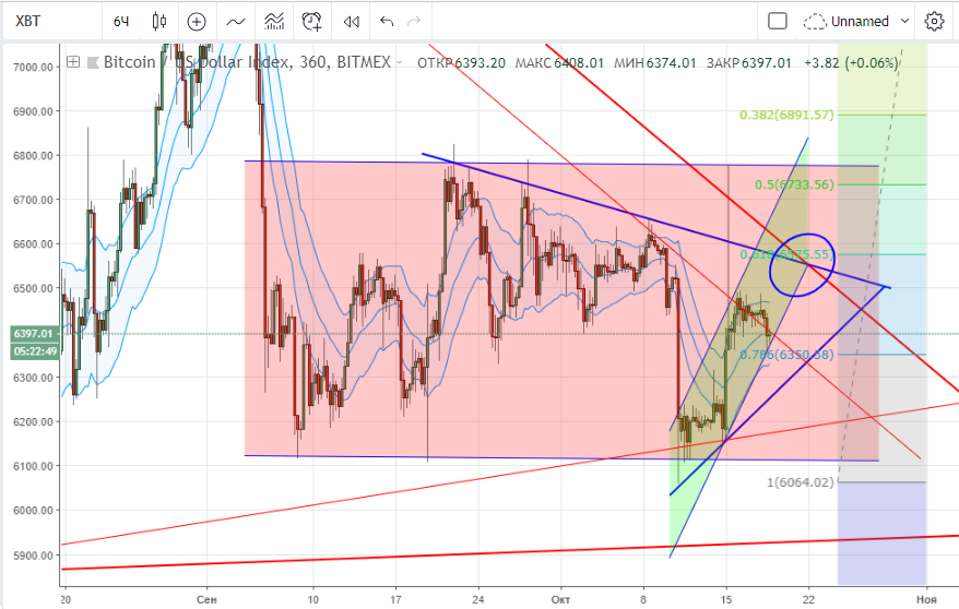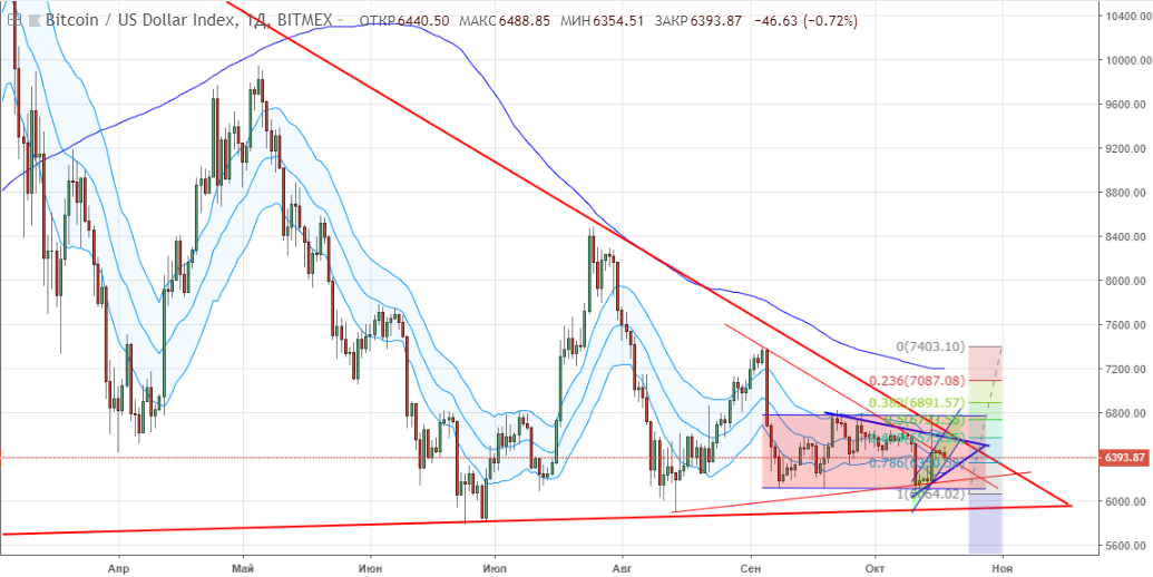 По дню (см график ниже) шла борьба за полку у середины канала Кельтнера ($6 450), и, пока что покупателям не удается преодолеть сопротивление. $6 350 (фибо 78,6% от $7 400) выступает в данном случае неплохой поддержкой. Ближайшая цель и сильный уровень сопротивления – фибо 61,8% совпадает с верхней границей большого треугольника.