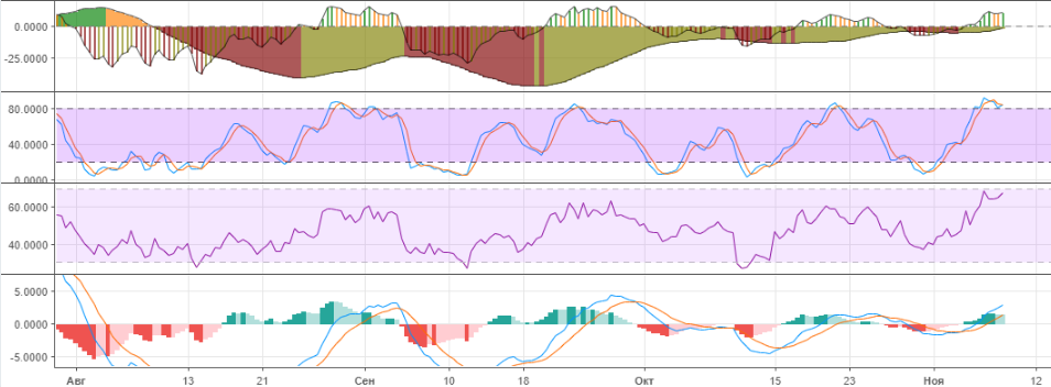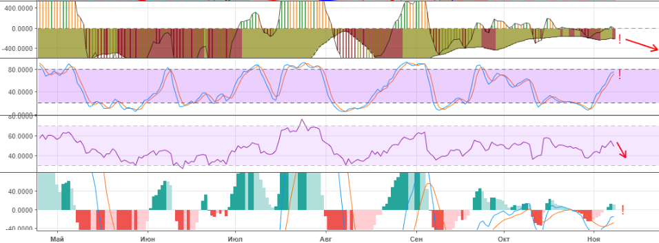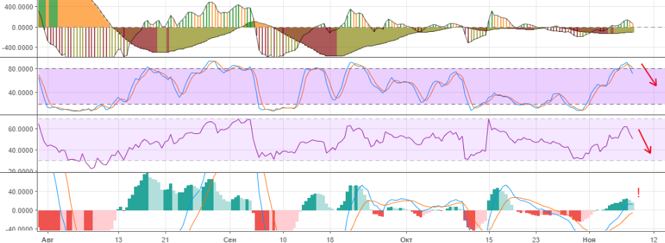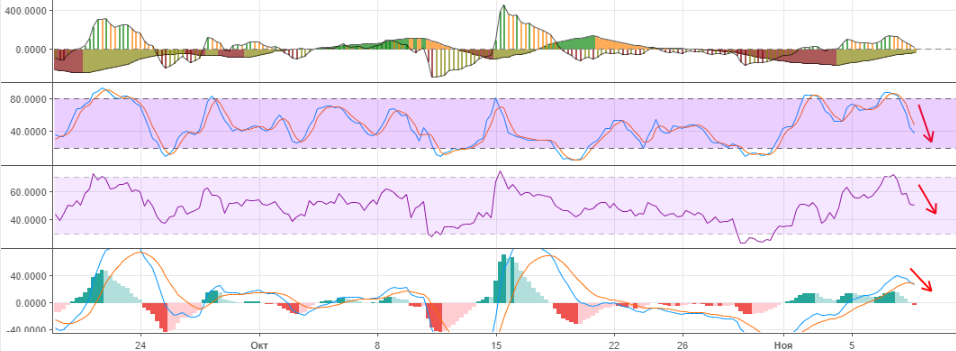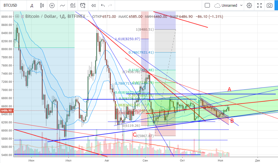 Как видим, сегодняшний день для покупателей пока что складывается не очень, сопротивление середины подканала AB оказалось не по зубам, поэтому, вполне можем вернуться к нижней линии поддержки B. Ближайший уровень поддержки находится на $6 440, но $6 340 тоже можем увидеть. В пользу этого говорят индикаторы по 6ч-12ч-1д.