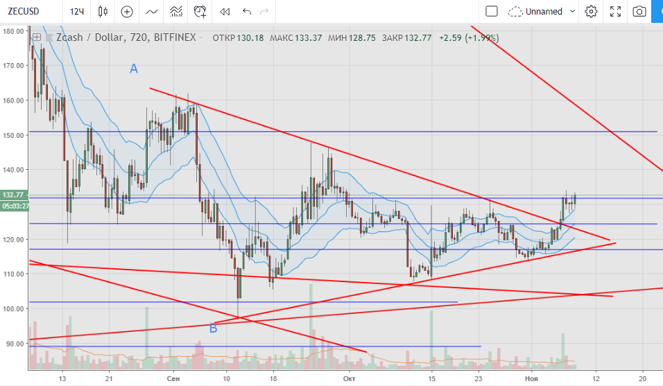 Пробили верхнюю границу треугольника AB, но, цена остановилась у $133 – там с начала Сентября установился сильный уровень сопротивления. На младших тафймфреймах все выглядит вполне и вполне неплохо, а вот по старшим монета уже вошла в зону перекупленности. Пока вижу смысл докупать от $134 с целью $145-$150. Но, может и стрельнет.