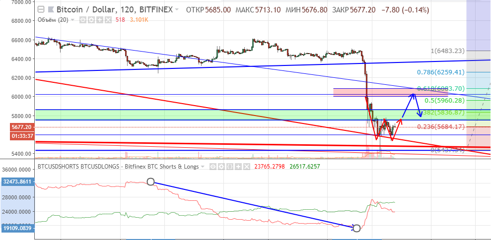 На 2-х часовом графике выше я показал возможное образование перевернутой двойной вершиной, при условии, если цене удастся выйти выше $5 750. Тогда отрабатываем фигуру в районе $6 000 и откатываемся обратно к зоне поддержки $5 750 — $5 850.