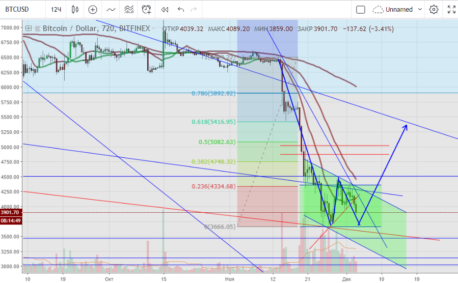 Пока не обновлены низы, все еще считаю актуальным реализацию варианта с двойной перевернутой вершиной и выходом к 50% — 61,85% фибо ($5 080 — $5 400). Сейчас все внимание на уровни и объемы.