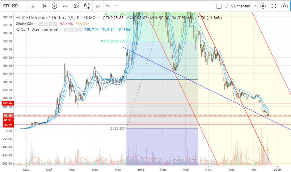 Цена эфира продолжает падение, но, на Bitfinex мы видим самые высокие объемы покупки за весь текущий год – более 1,2 млн эфира в дневной свече 7 Декабря. Это говорит нам о том, что монета стала очень привлекательной по цене ниже 100 баксов.