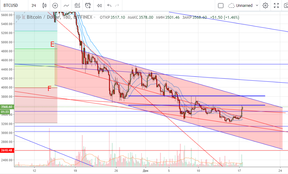 Теперь к текущим делам на рынке. Появился некоторый временный позитив, правда, в основном по альте (рост курса битка составил «всего» $300). Отработка двойной перевернутой вершины увела цену к круглым $3 600, по 3-м часам на индикаторах уже появилась перепроданность. С такими объемами далеко не поедем, $3 800 сейчас выглядит точкой максимум, куда пока можем сходить. Под $3 600 можно подсократиться.