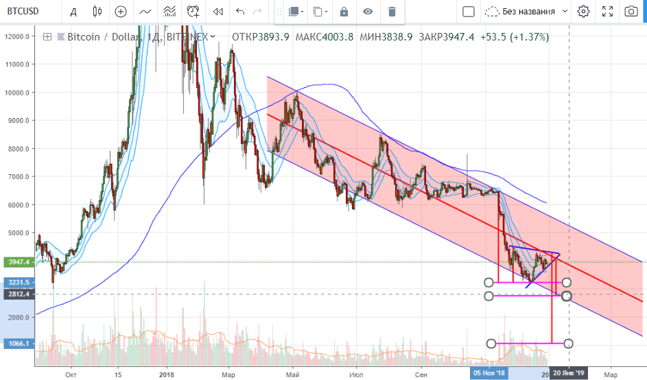 По дню, помимо пГИП есть еще и медвежий вымпел с верхней границей на $4 300 (чуть ниже, на $4 200 проходит середина нисходящего канала, в котором цена битка движется с начала апреля этого года).