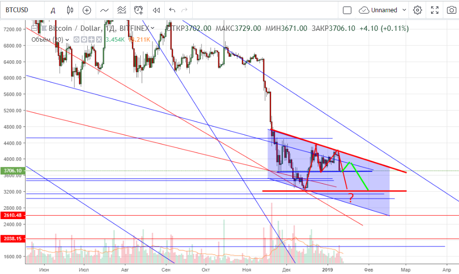 Прошлая идея пока в силе, купля держится, но небольшим комфортным объемом. $3 850 — $3 900, $4 000 — $4 050 (максимум, на что можно рассчитывать). В целом продолжаем медвежий марафон с целью как минимум прошлое лоу, при сильных проливах уйдем к $2 800 — $2 600 раньше времени. В конце Января намечен запуск платформы Bakkt. Посмотрим, возможно, это внесет какие-то коррективы в дальнейшее движение цены.
