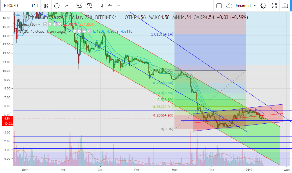 Классик после падения с начала Декабря скорректировался к фибо 38,2%, так сказать, задача минимум выполнена. Думаю, ближайшее время должен быть откат и тест поддержки/нижней границы подканала на $4. При самом медвежьем раскладе по битку не удивлюсь классику дешевле $1.