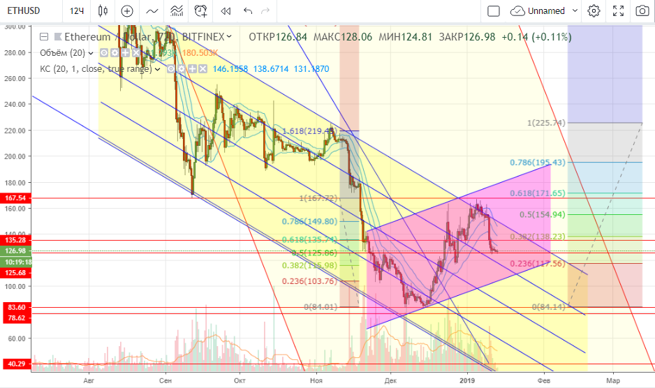 Эфирка после падения с $225 до $83 скорректировалась к $167, фибо 61,8% (чуть не дотянули, но, тем не менее, все по классике жанра). По аналогии с битком иметь небольшую куплю от текущего уровня позволительно.