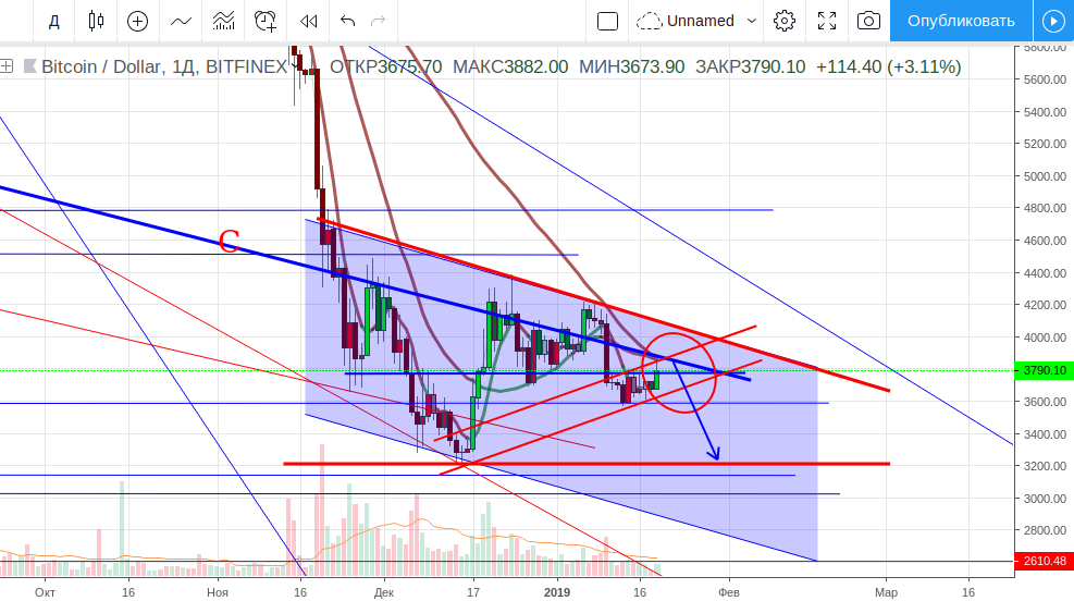 Если до числа 23-24 покупатели так и не смогут победить уровень сопротивления на $3 850 — $3 900, то ожидаю движение вниз и повторный заход на декабрьский лоу $3 220.