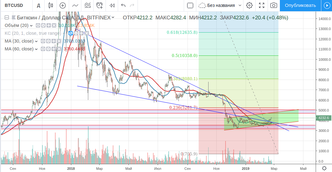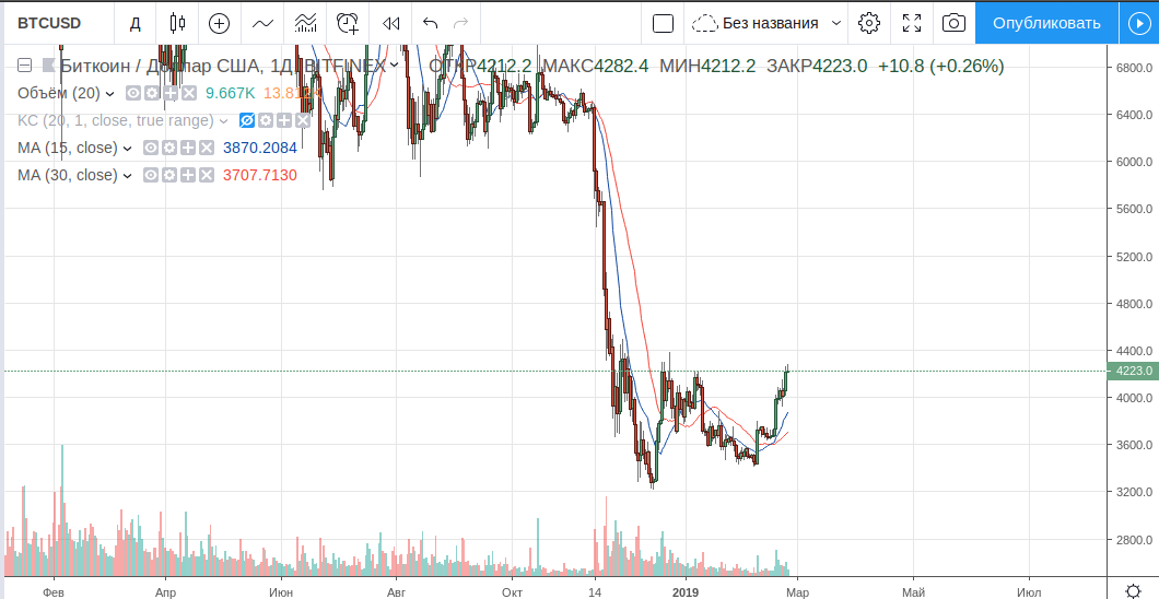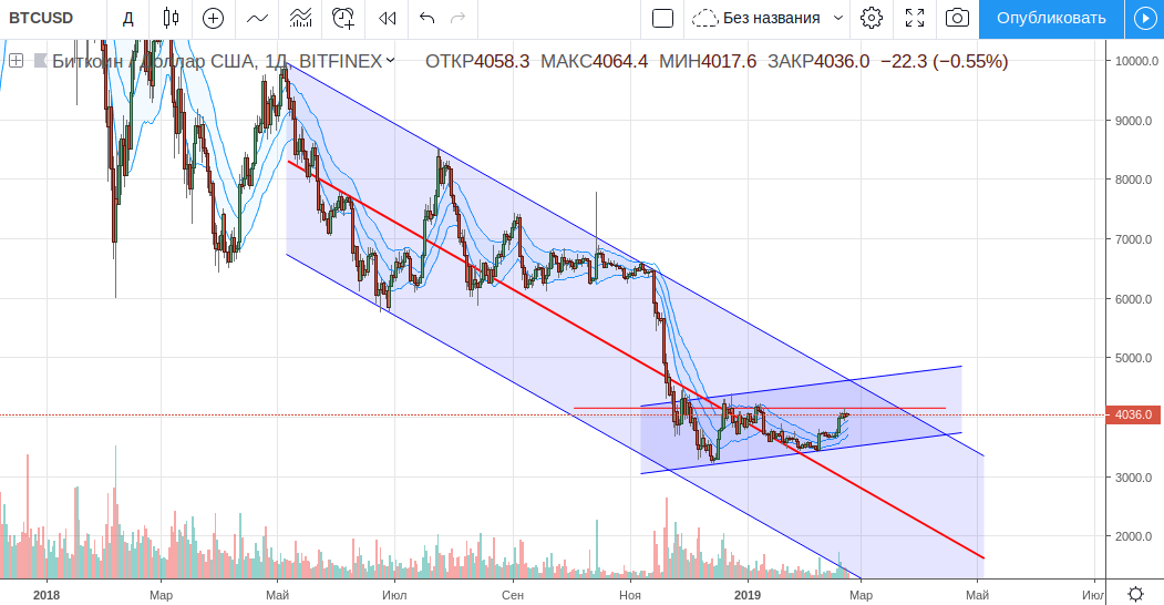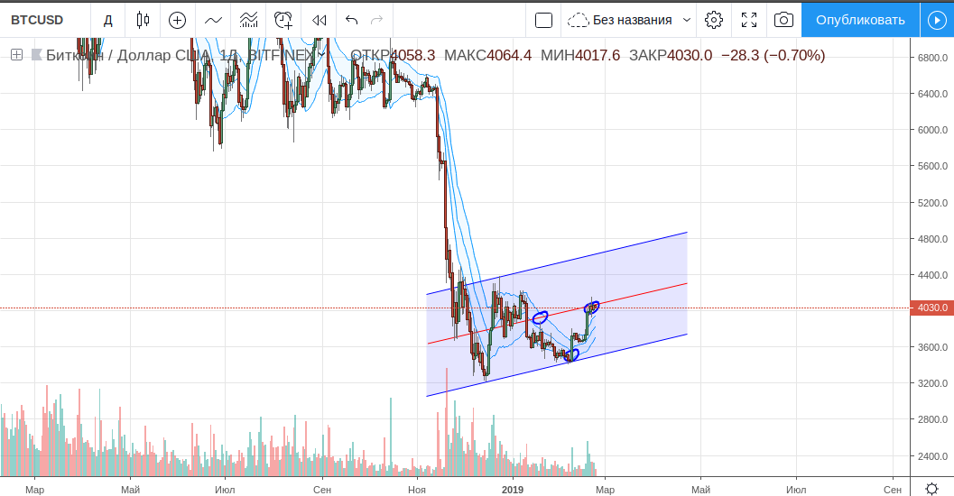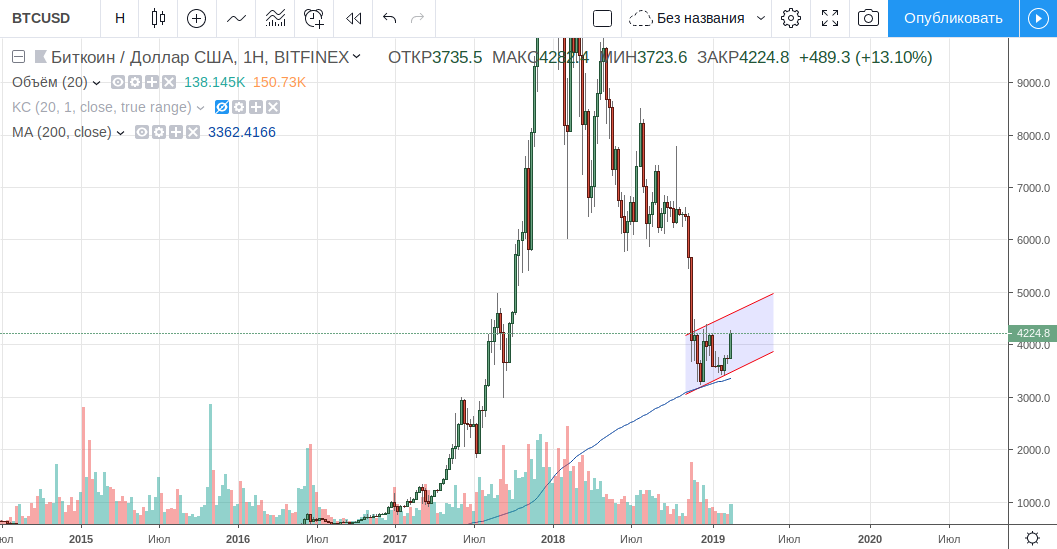 В текущей ситуации видно, что цена преодолела линии сильного сопротивления на $3 800 и в скором времени, судя по пересечению мувингов, будет борьба за полку $4 400 — $4 500.