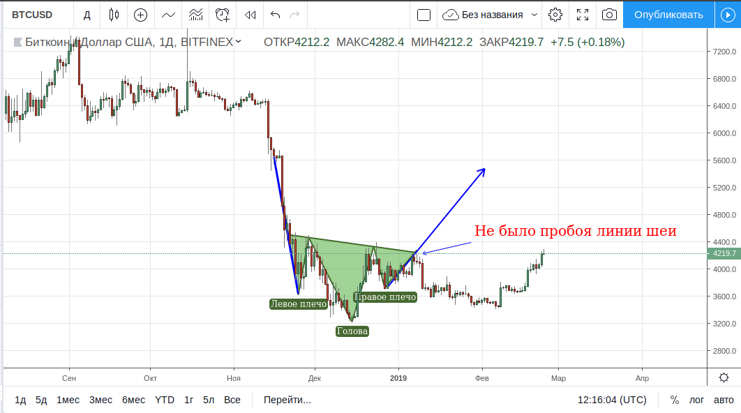 Мы не входим в рынок сразу, как только видим Голову и Плечи. Необходимо дождаться сигнала – пробоя линии шеи, так что стоит проявить немного терпения: бывает, что паттерн не срабатывает. Например, как получилось совсем недавно на паре BTC/USD: