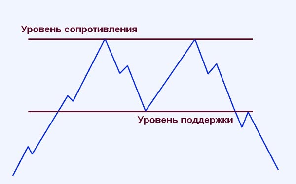 3. Графические фигуры. В трейдинге широко распространены и используются графические фигуры технического анализа. Пожалуй самой популярной является двойная вершина или дно. Выглядит она следующим образом: