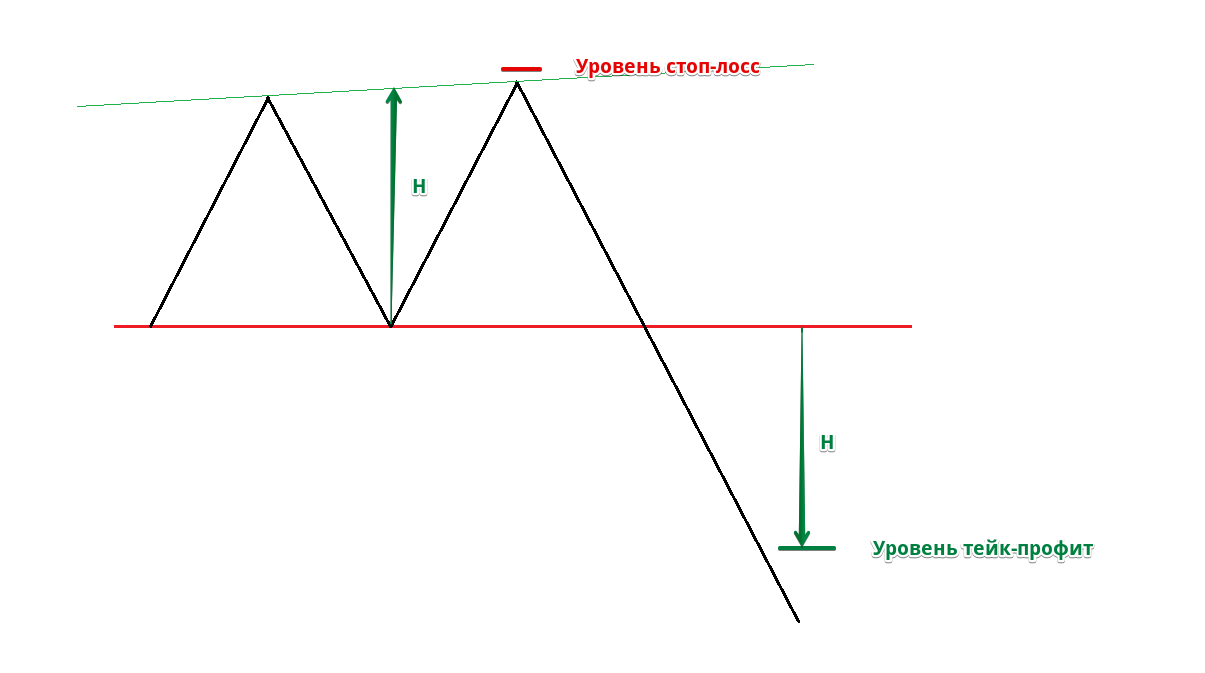 Стоплосс и тейкпрофит (где поставить стоп и зафиксировать прибыль). Для определения уровня takeprofit, нужно взять высоту между хаем вершин и лоу между ними и отмерить такое же расстояние вниз от линии шеи (как на рисунке ниже):