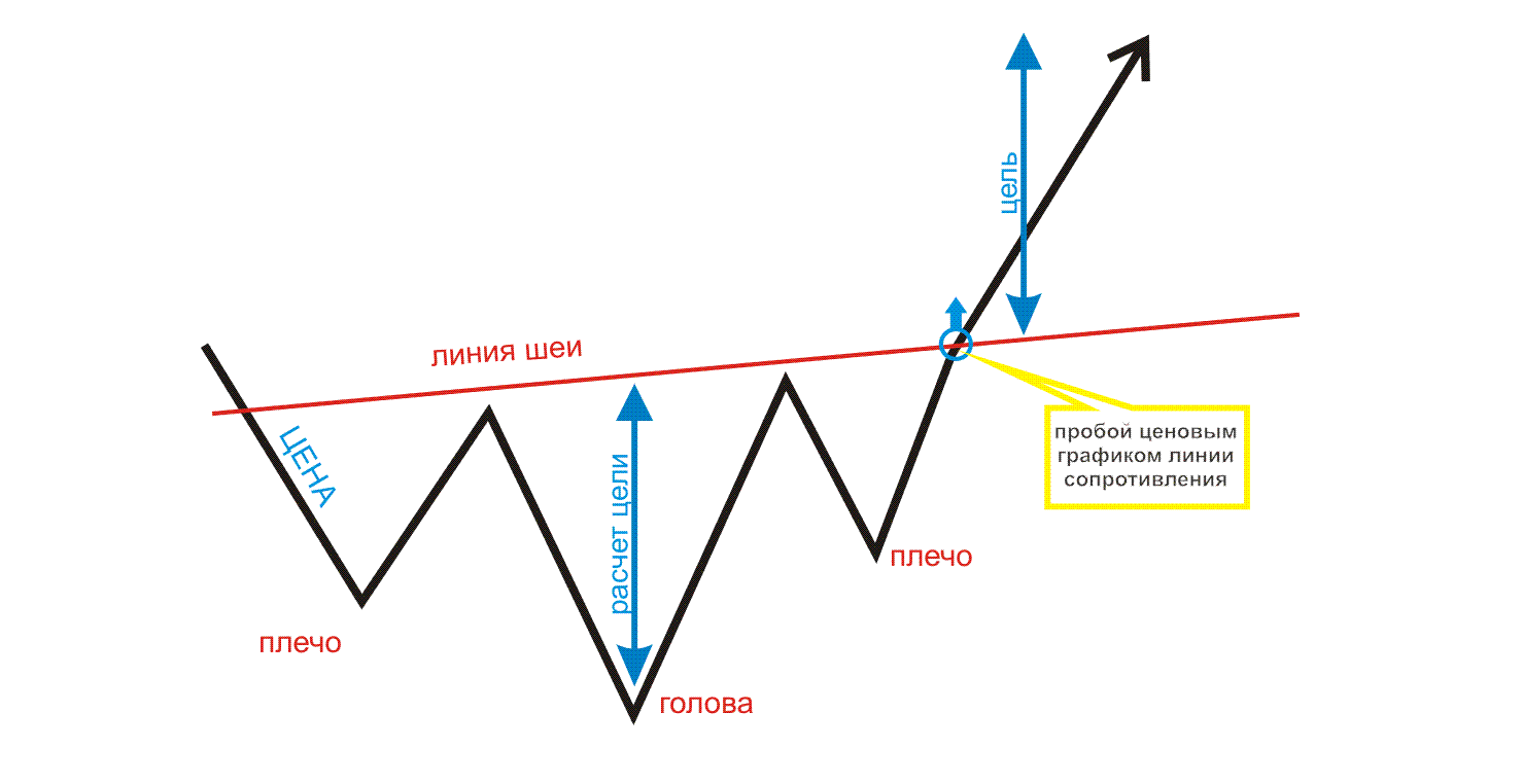 По аналогии с двойным дном существует также перевернутый паттерн, когда последовательно образуются 3 минимума, лежащих на линии шеи. Это перевернутая «Голова и плечи», не утративший силы зеркальный сигнал.