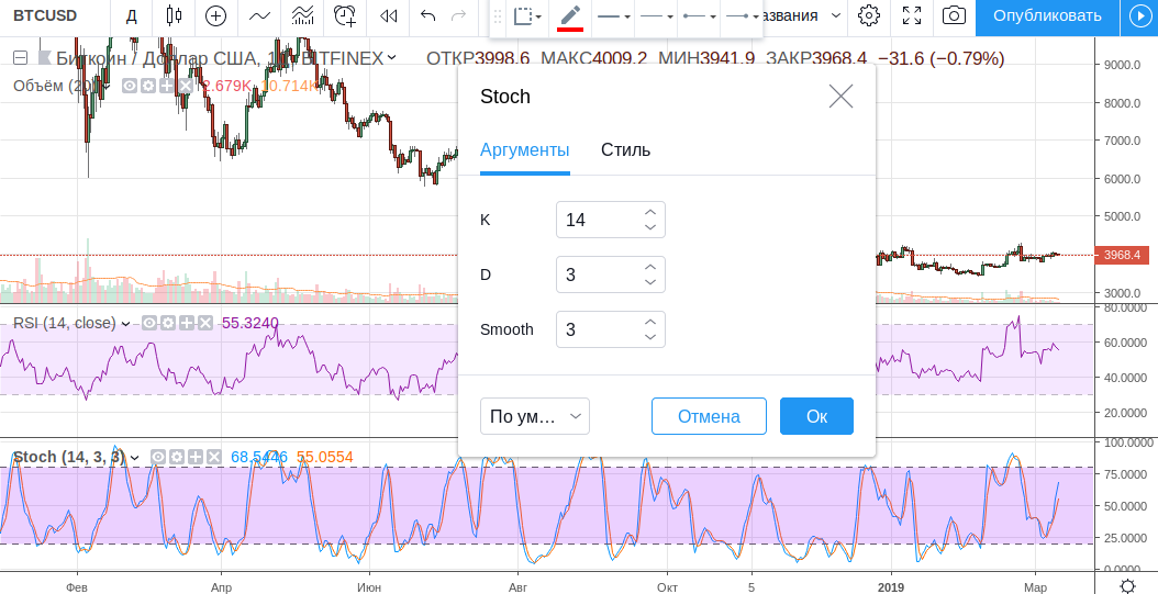 - Период %D – период скользящей средней по отношению к %K