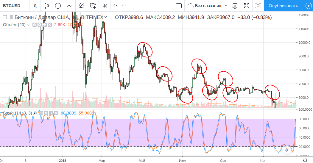 Считается, что количество ложных сигналов при наличии тренда будет больше, чем во время бокового движения цены. Иными словами стохастик лучше работает на флэте. Хотя, тут можно и поспортить — на крипте он великолепно показывает точки разворота даже тогда, когда есть ярко выраженный тренд: