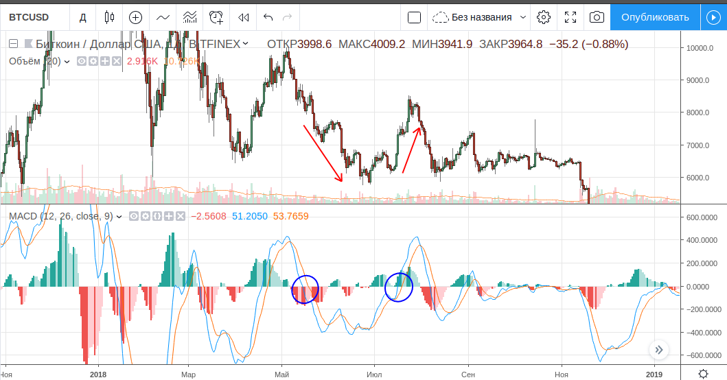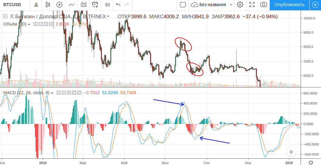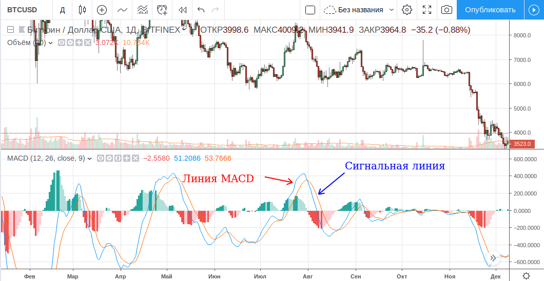 - Линия MACD: EMA 12 дней — EMA 26 свечей