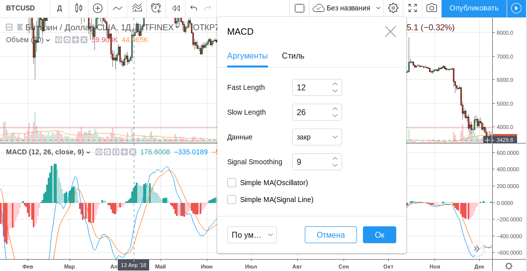 Как правило, периоды берутся 12, 26 и 9, а цена для расчетов – закрытие свечи. Именно такие периоды (12 и 26) рекомендовал сам Аппель для желающих продавать. Для покупателей автор рекомендовал использовать 8 и 17. Правда, это касалось рынка акций, в случае с криптой можно смело использовать стандартные периоды или подобрать свои.