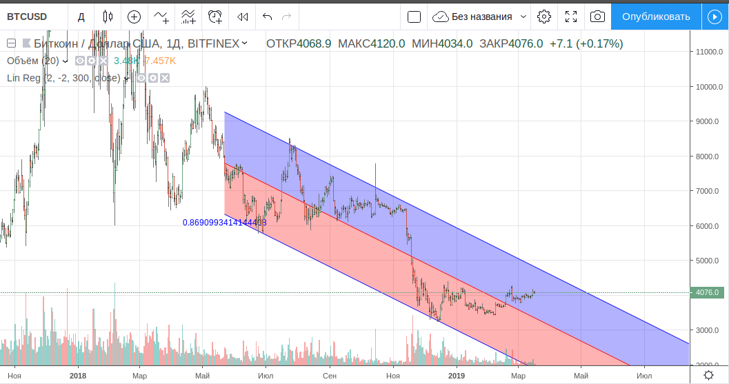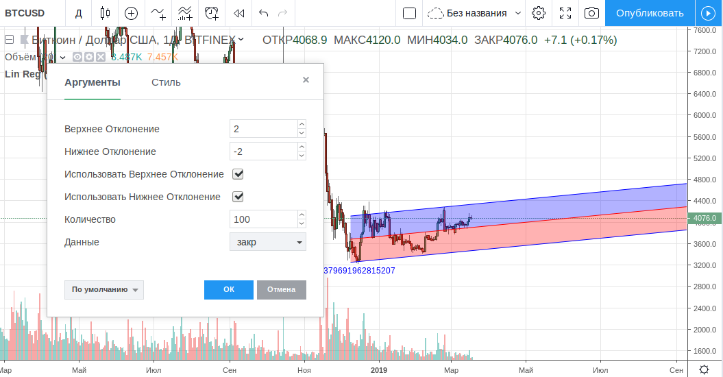 Отображается индикатор линейной регрессии на графике в виде канала, который образуют две параллельные линии, равноудаленные от тренда. Ширина этого коридора зависит исключительно от выбранного таймфрейма.