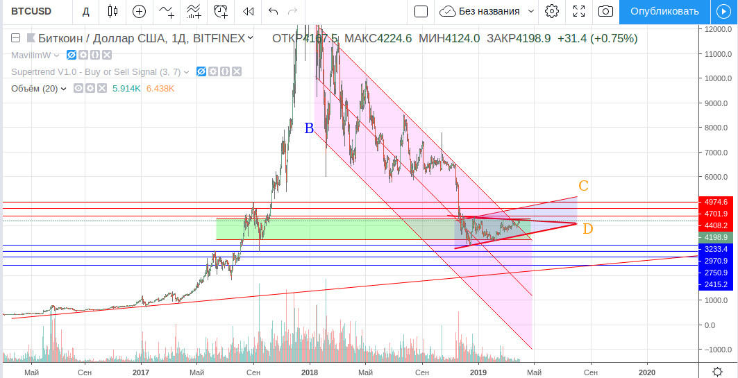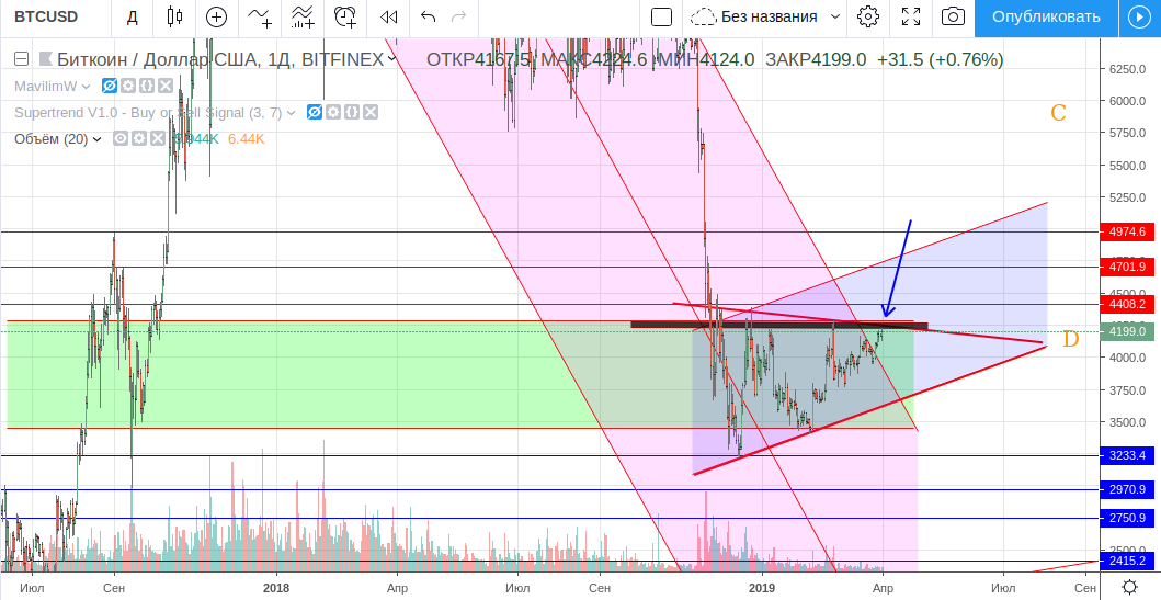 На примере текущей ситуации мы видим, что цена преодолела сопротивление основного канала AB, подошла к верхней границе треугольника + к почти к хаю всей этой заварушки, что тянется с конца Ноября прошлого года.