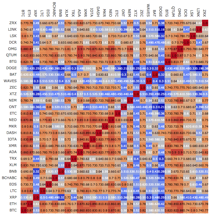 - Ripple обнаруживает сильную корреляцию со Stellar (0,73). Хотя изначально Stellar был построен на основе протокола Ripple, его программный код вскоре был выведен в отдельную ветвь и значительно обновлен. На сегодняшний день код Stellar и Ripple уже не основывается на одном общем ядре. И тем не менее, между этими двумя активами по прежнему есть определенное сходство, поскольку оба они направлены на «изменение глобальной индустрии денежных переводов».