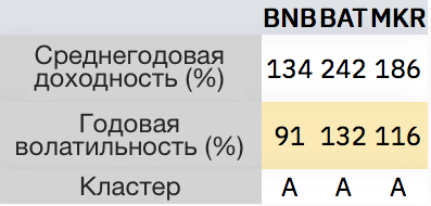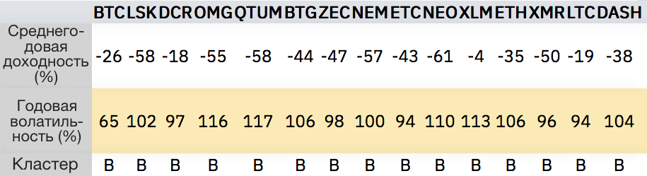 Кластер B состоит из цифровых активов с высокой волатильностью, но отрицательной средней доходностью в исследуемый период.