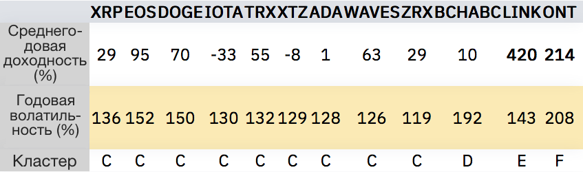 - Ontology (ONT) формирует кластер F. Поскольку недельная доходность Ontology обычно не распределяется (при экстремально высоких положительных значениях), его средняя доходность в годовом исчислении сильно тяготеет к повышению.