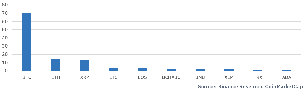 Bitcoin, Ethereum и Ripple составляют большую часть общей рыночной капитализации отрасли.