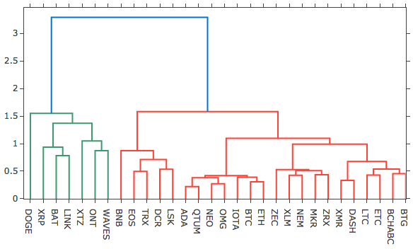 - Конфиденциальные койны, такие как DASH и Monero (XMR) принадлежат к одному подкластеру. Stellar (XLM) и NEM являются платежными системами, и в конечном итоге образуют единый кластер.