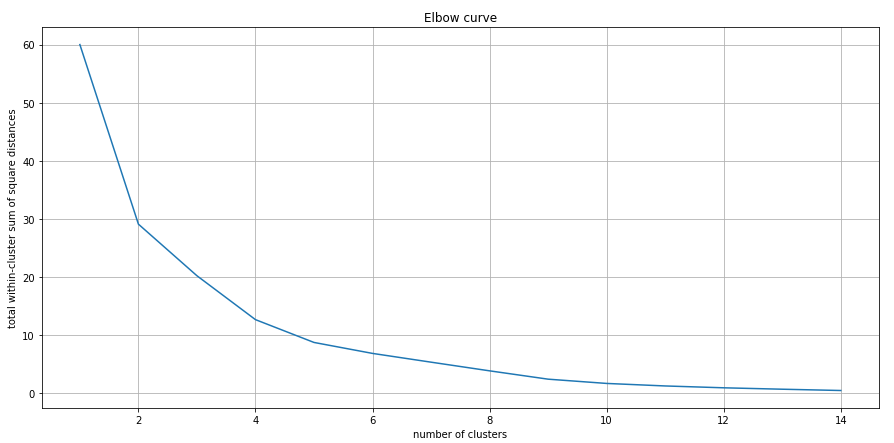 Если отталкиваться от приведенной выше цифры, то оптимальным количеством кластеров представляется что-то около 6, поскольку маржинальное улучшение общей суммы квадратов расстояний внутри кластера при большем количестве кластеров становится чрезвычайно малым.