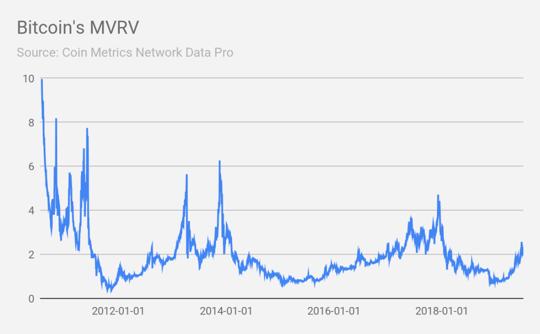 В прошлом декабре Coin Metrics представили (англ.) одну из таких нативных для криптоактивов оценочных метрик, реализованную капитализацию. Реализованная капитализация криптоактива рассчитывается путем умножения каждой единицы предложения на ее стоимость в момент последнего перемещения. Другими словами, эта метрика оценивает стоимость предложения на момент, когда держатели актива зафиксировали прибыль или убыток, продав принадлежащие им монеты. По сравнению с рыночной капитализацией, реализованная капитализация изменяется намного более плавно, без резких перепадов: