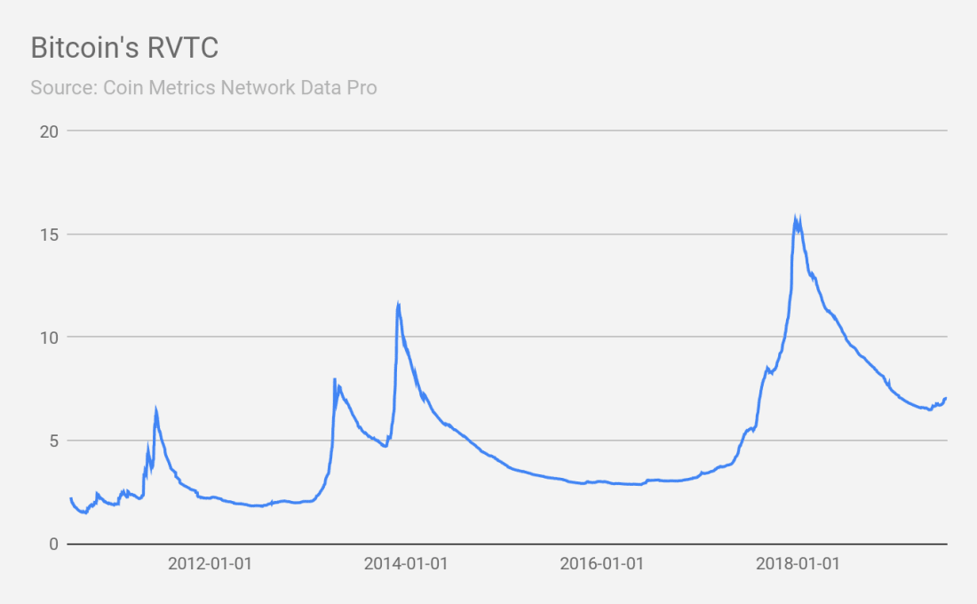 Каждый пик на графике RVTC указывает на пиковые значения предыдущих ценовых пузырей (один в 2011 году, два в 2013 и один в 2017). Для Биткойна это отношение имеет естественную тенденцию к росту, так как постоянное сокращение эмиссии ограничивает рост термокапитализации.