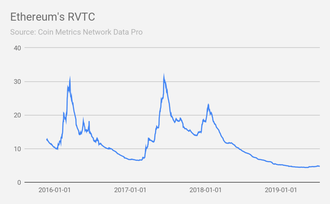Мы опустили значения RVTC Эфириума за первые месяцы, поскольку они аномально высоки. Это связано с тем, что к моменту запуска блокчейна Эфириума большая часть объема предложения ETH была уже выпущена. Следовательно, реализованная капитализация по сравнению с термокапитализацией была очень высока.