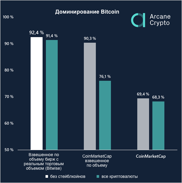 Анализ, проведённый Arcane Research, показал, что реальный уровень доминирования Биткойна на рынке намного выше того, о котором обычно сообщается