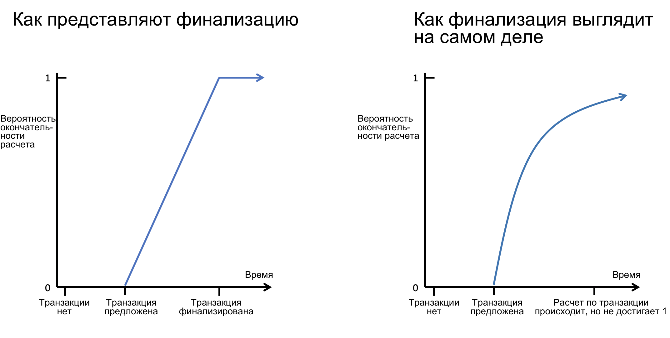 Но это фундаментальные вопросы. Если вы считаете, что публичные блокчейны с открытыми группами валидаторов и распределёнными механизмами конвергенции будут существовать и в обозримом будущем использоваться для передачи стоимости, то об этих вопросах стоит задуматься. А если вы управляете биржей и ваш финансовый достаток зависит от правильной оценки требуемого количества подтверждений на различных блокчейнах, то они имеют и вовсе решающее значение. Для начала позвольте мне объяснить, почему я считаю, что гарантии расчёта по транзакциям (их финализация) – это главное, на что стоит обращать внимание при рассмотрении любого публичного блокчейна.