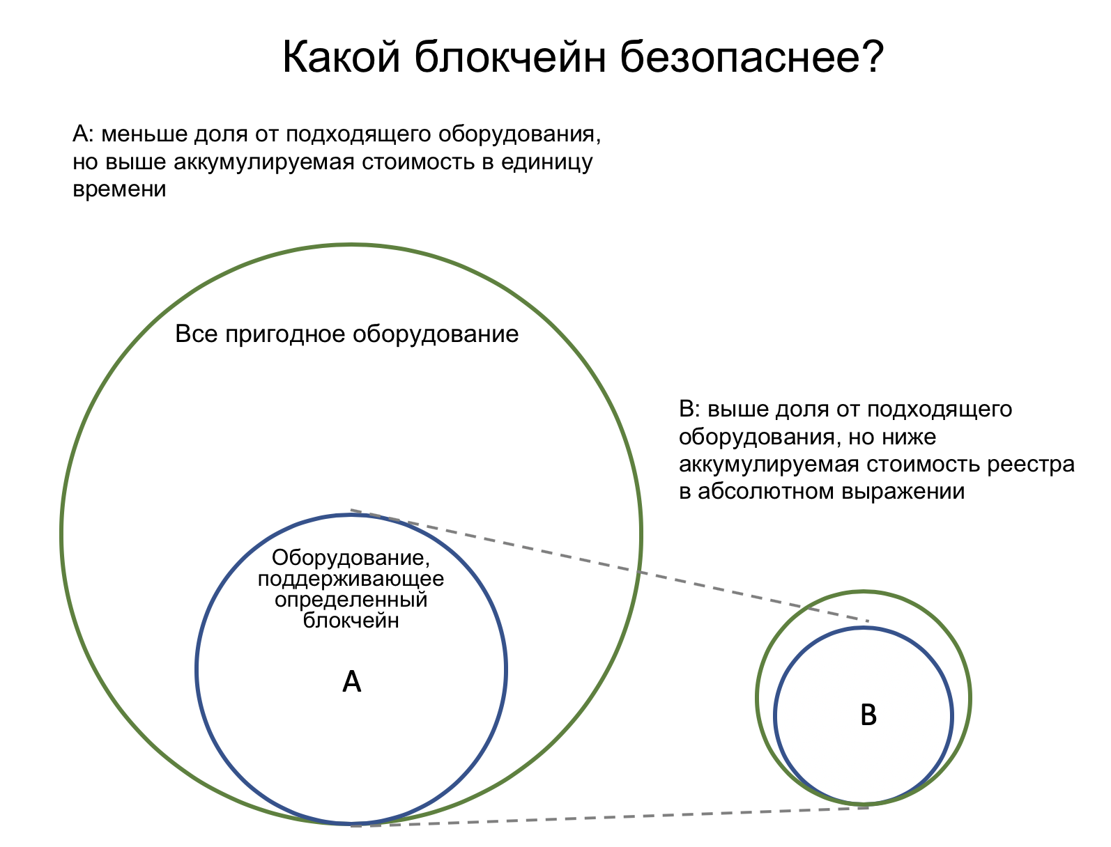 В этом примере я бы охарактеризовал блокчейн A как менее безопасный в сравнении с B, даже при том, что он имеет бóльшую стоимость реестра в абсолютном выражении, потому что привлечь достаточное количество оборудования для атаки на блокчейн A теоретически проще.